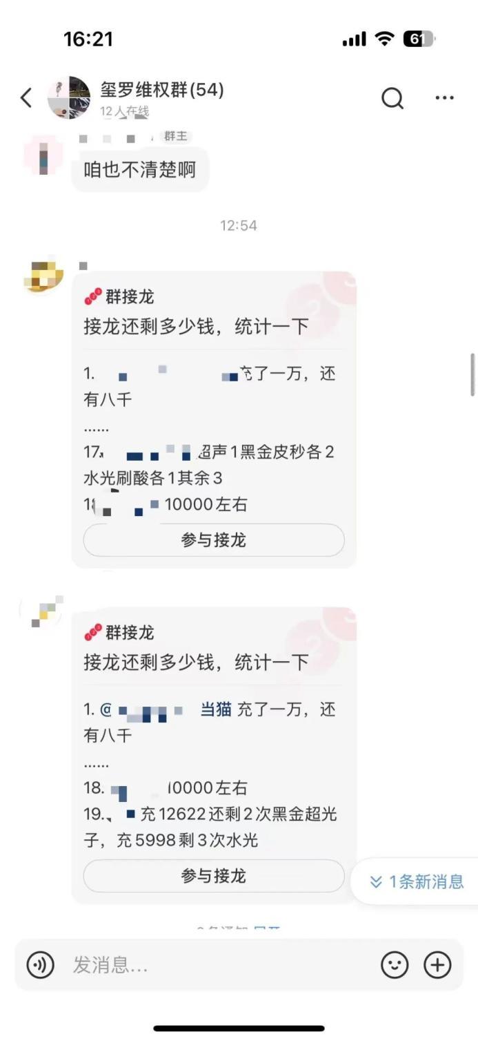 9月19日,记者通过发帖人员进入到一个维权群,群内有50多名消费者,已发起接龙统计剩余未消费金额。