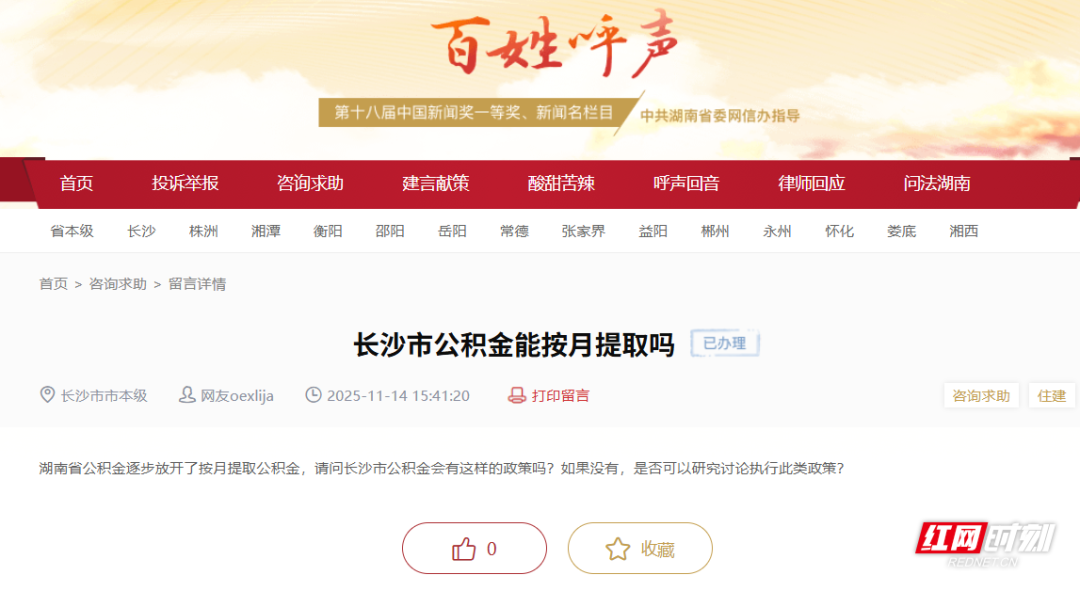 红网时刻新闻11月20日(记者 陈星晓)近日,有网友在红网《百姓呼声》栏目咨询长沙市住房公积金能否可像湖南省公积金一样实行按月提取政策。对此,长沙住房公积金管理中心作出详细回应,明确了当前提取的相关规定。