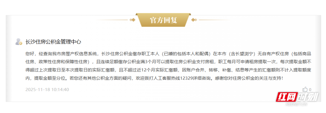 长沙住房公积金管理中心在回复中表示,公积金缴存职工本人(已婚的包括本人和配偶)如在长沙市行政区域(含长沙县、望城区、浏阳市、宁乡市)内无自有产权住房(包括商品住房、政策性住房和保障性住房),且连续足额缴存公积金满3个月可以提取住房公积金支付房租,职工每月可申请租房提取一次。