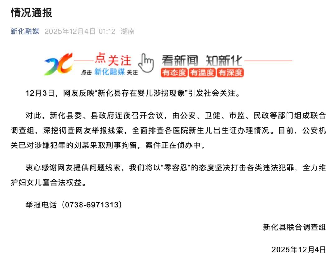 12月3日,网友反映“新化县存在婴儿涉拐现象”引发社会关注。