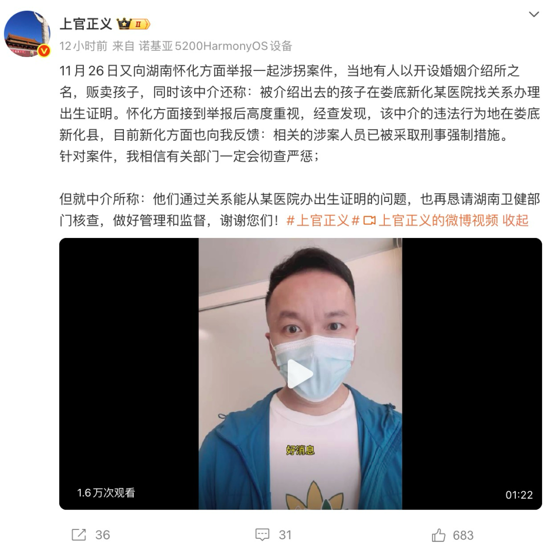 此前,@上官正义 发文:湖南怀化有人以开设婚姻介绍所之名,贩卖孩子,同时该中介还称“被介绍出去的孩子在娄底新化县某医院找关系办理出生证明。”