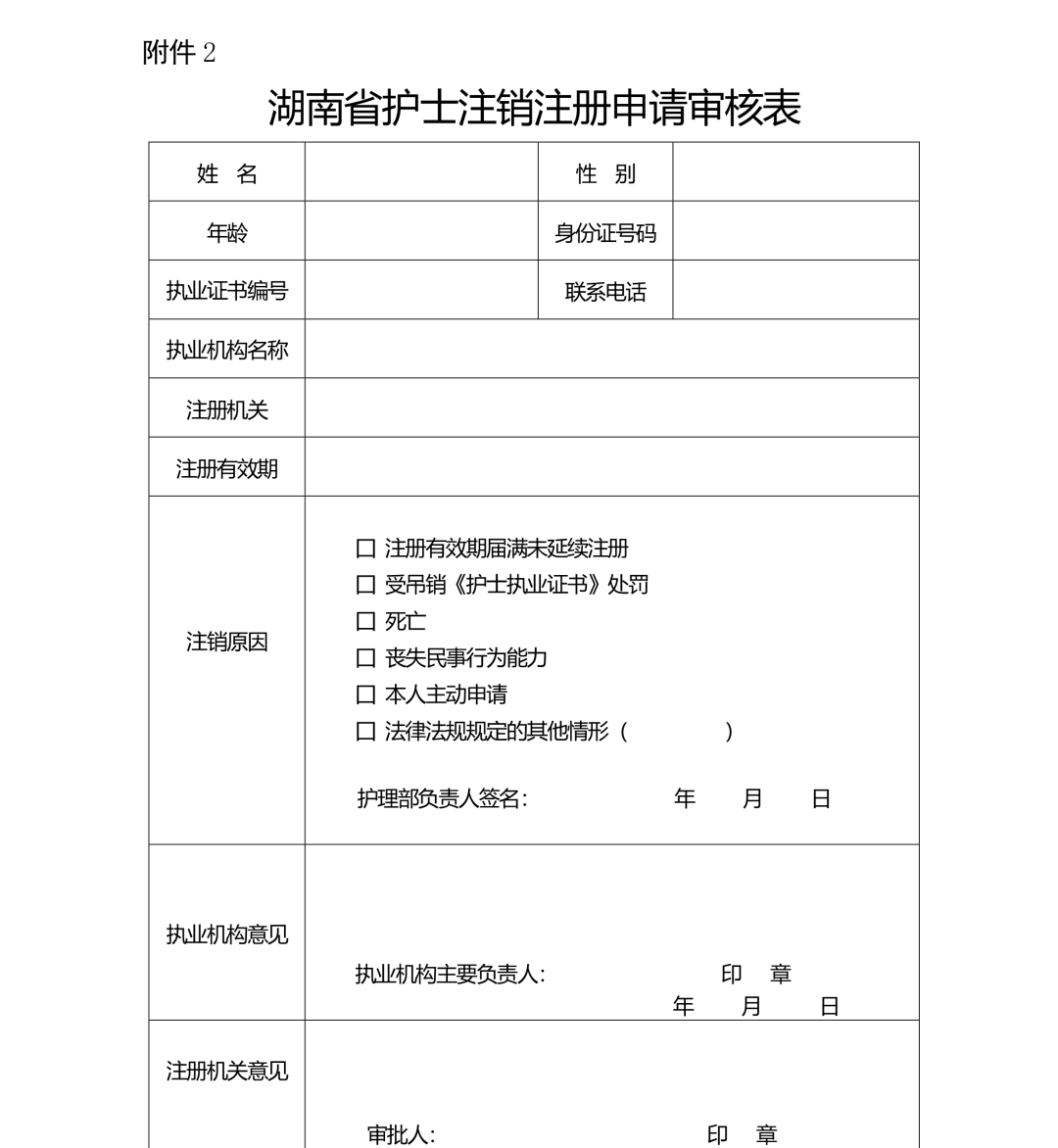 由本人提出注销申请的,需向注册实施机关提交《湖南省护士注销注册申请审核表》和申请人身份证明复印件、《护士执业证书》。