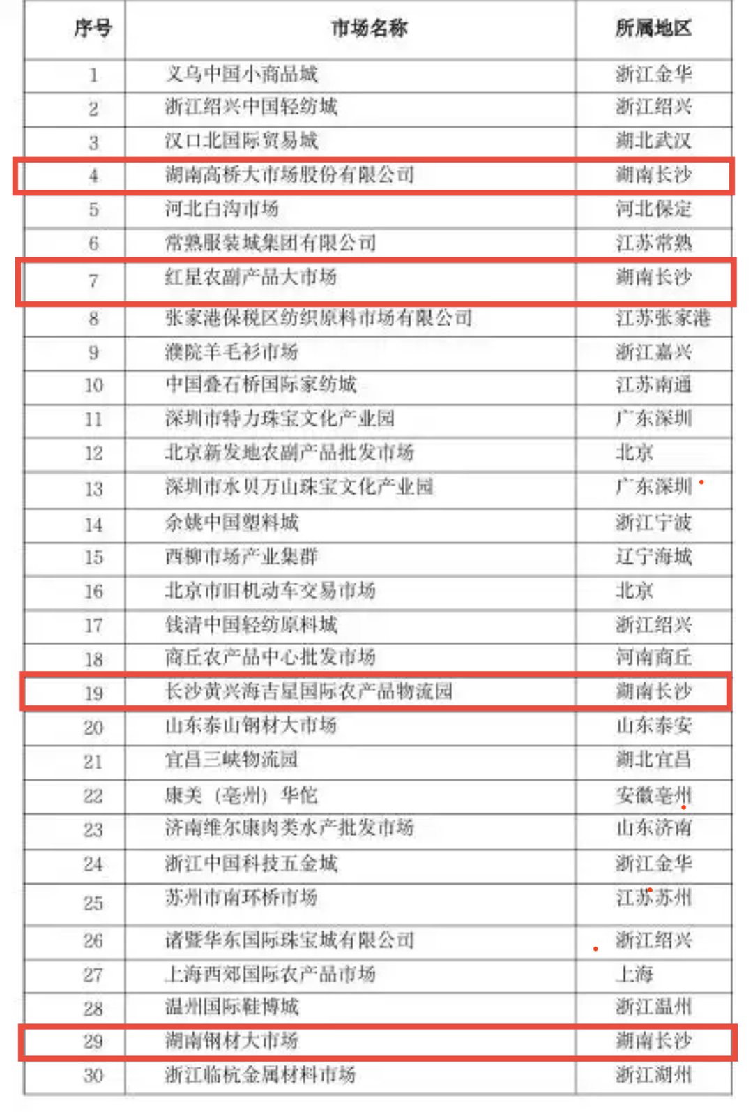 此次湖南上榜的4个商品市场,分别为位列第4位的湖南高桥大市场,位列第7位的红星农副产品大市场,位列第19位的长沙黄兴海吉星国际农产品物流园,以及位列第29位的湖南钢材大市场。