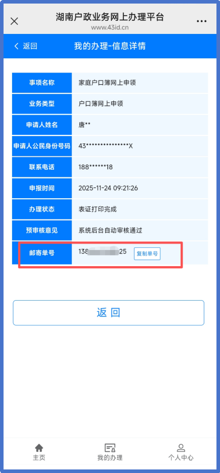 三、办件状态实时通过短信推送给申请人,申请人也可在平台首页“我的办理-查看详情”中查询详情。