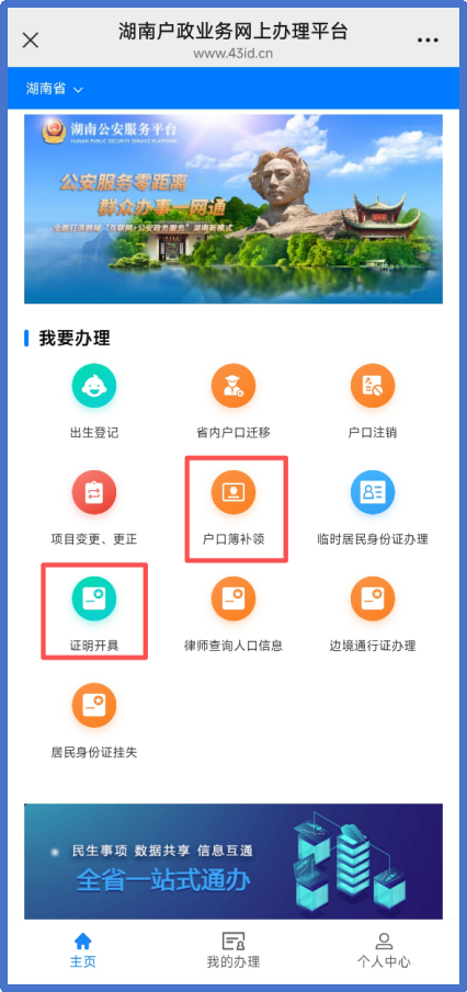 一、湘籍居民微信关注“湖南公安服务平台”公众号,注册并实人认证登录,点击“微警务”进入平台首页,在热点应用栏中选择“户口业务全程网办”;或者登录省政府“湘易办”APP首页,点击“户口业务”,进入湖南户政业务网上办理平台,在“我要办理”菜单中选择要申办的四项业务,填写相关信息,拍照上传证明材料,提交办件申请。