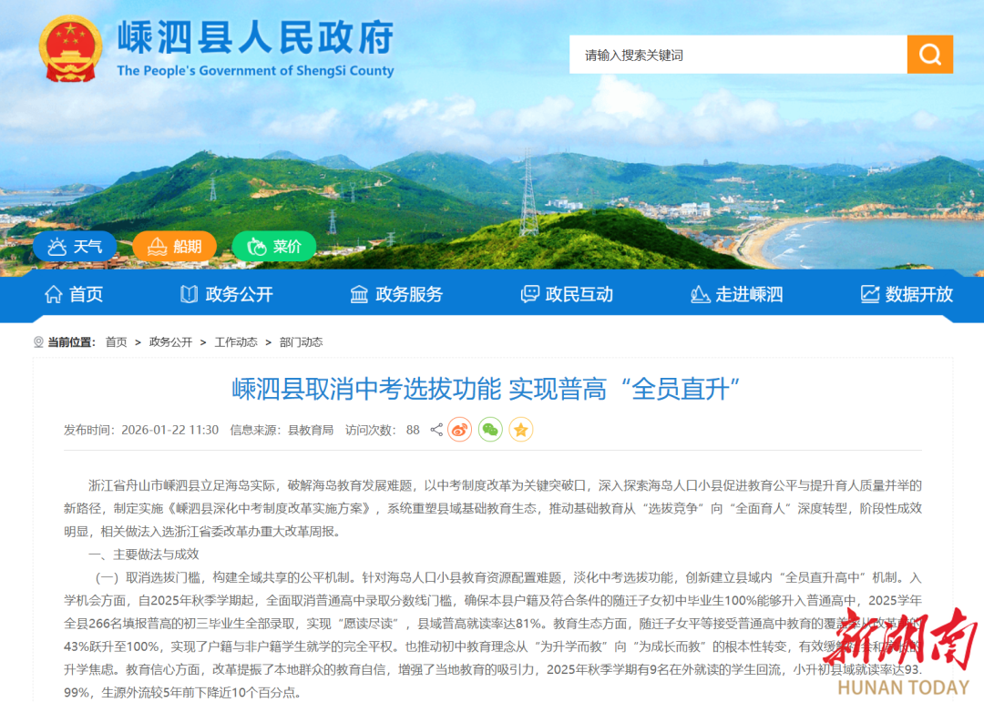为什么这么做?嵊泗县是个海岛县,常住人口才6万多,去年新生儿只有148个,初中毕业生一年也就300多人,县里唯一的高中——嵊泗中学的学位已能基本覆盖。这种情况下,如果还硬要通过中考分数来“卡人”,只会放大竞争,加剧“内卷”。