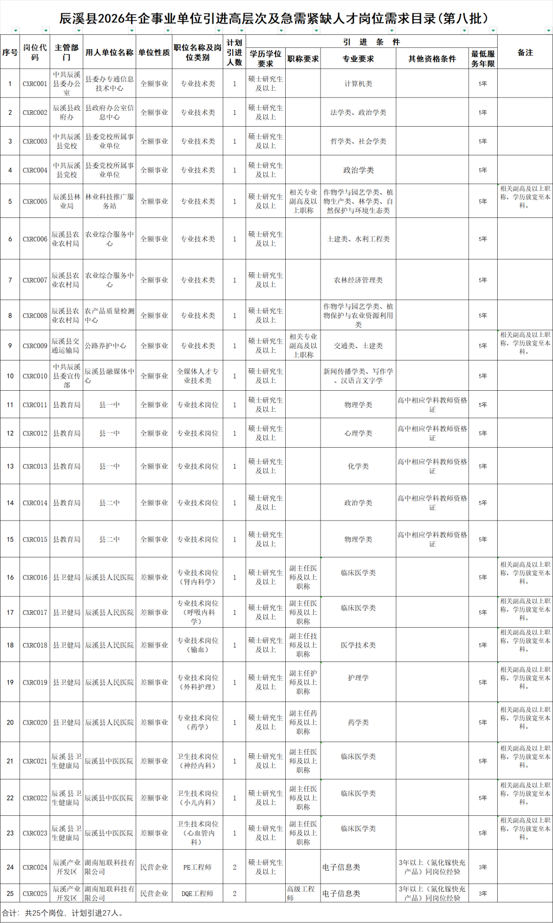 怀化辰溪县企事业单位引进高层次及急需紧缺人才公告