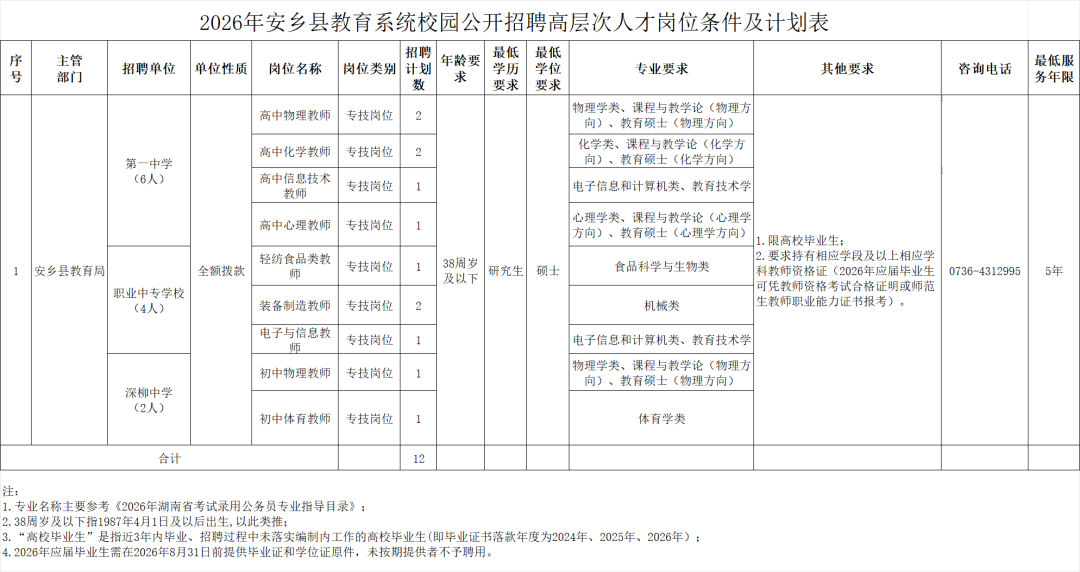 常德市安乡县教育系统校园公开招聘高层次人才公告