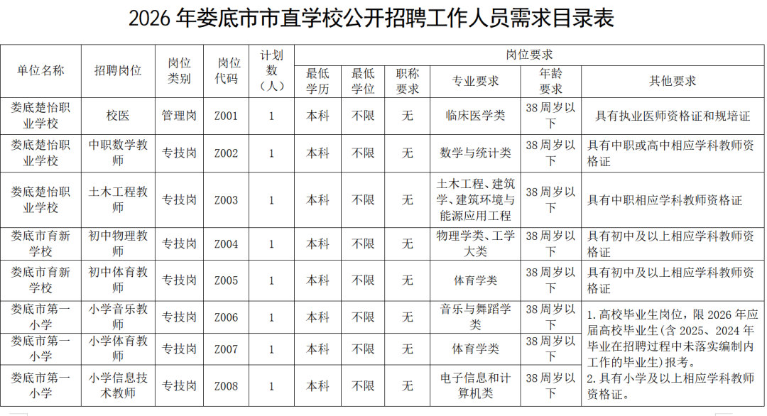 娄底市市直学校2026年公开招聘工作人员公告