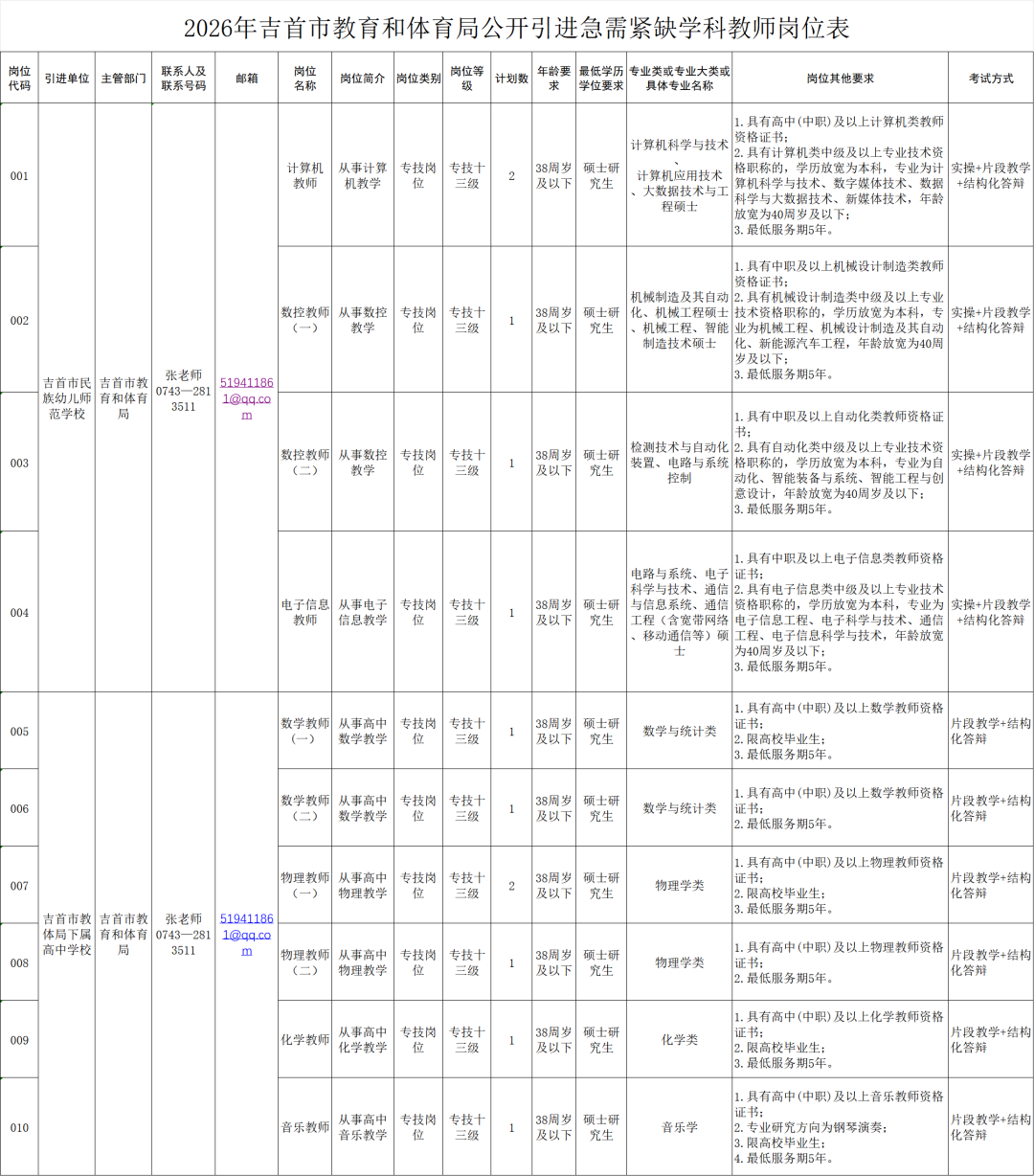 湘西自治州吉首市教育和体育局下属学校公开引进急需紧缺学科教师公告