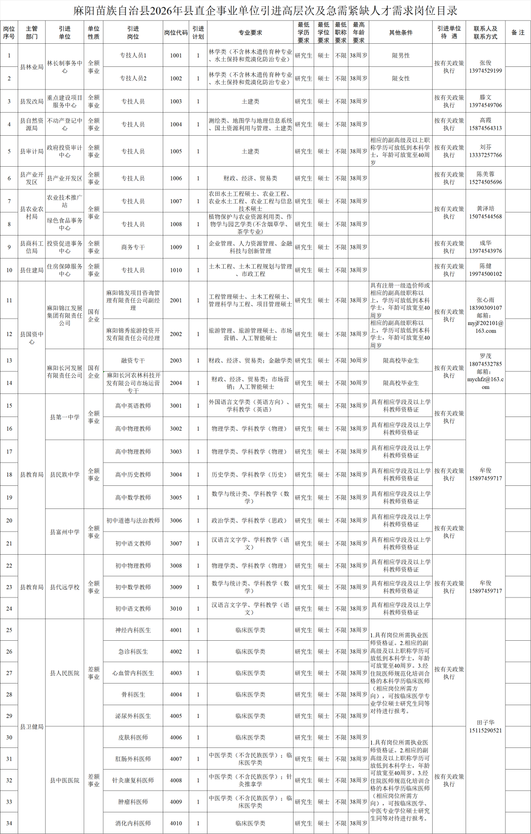 怀化麻阳苗族自治县2026年县直企事业单位引进高层次及急需紧缺人才公告