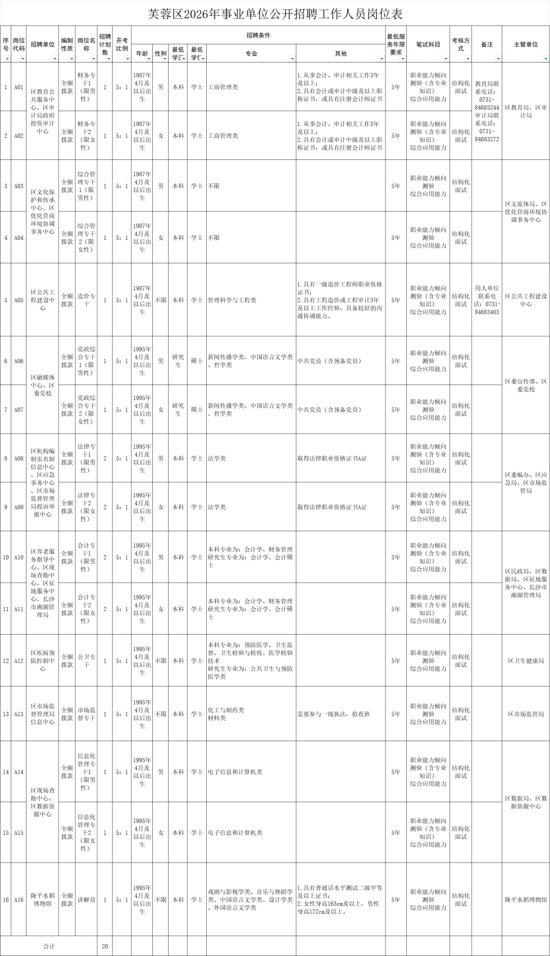 长沙市芙蓉区2026年公开招聘事业单位工作人员公告