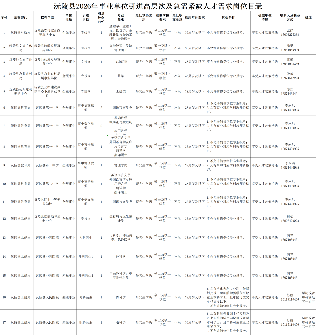 怀化沅陵县事业单位引进高层次及急需紧缺人才公告
